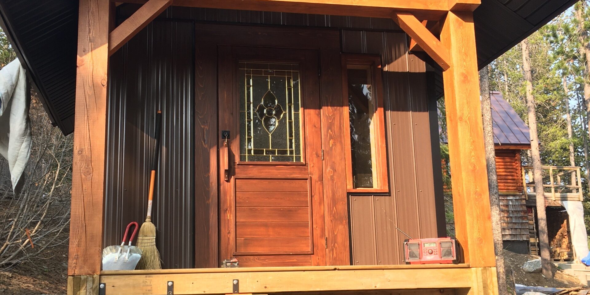 Timber frame gable built with Douglas Fir Timbers . Interior of sauna is western red cedar. Will be updated once homeowners have installed their stove.